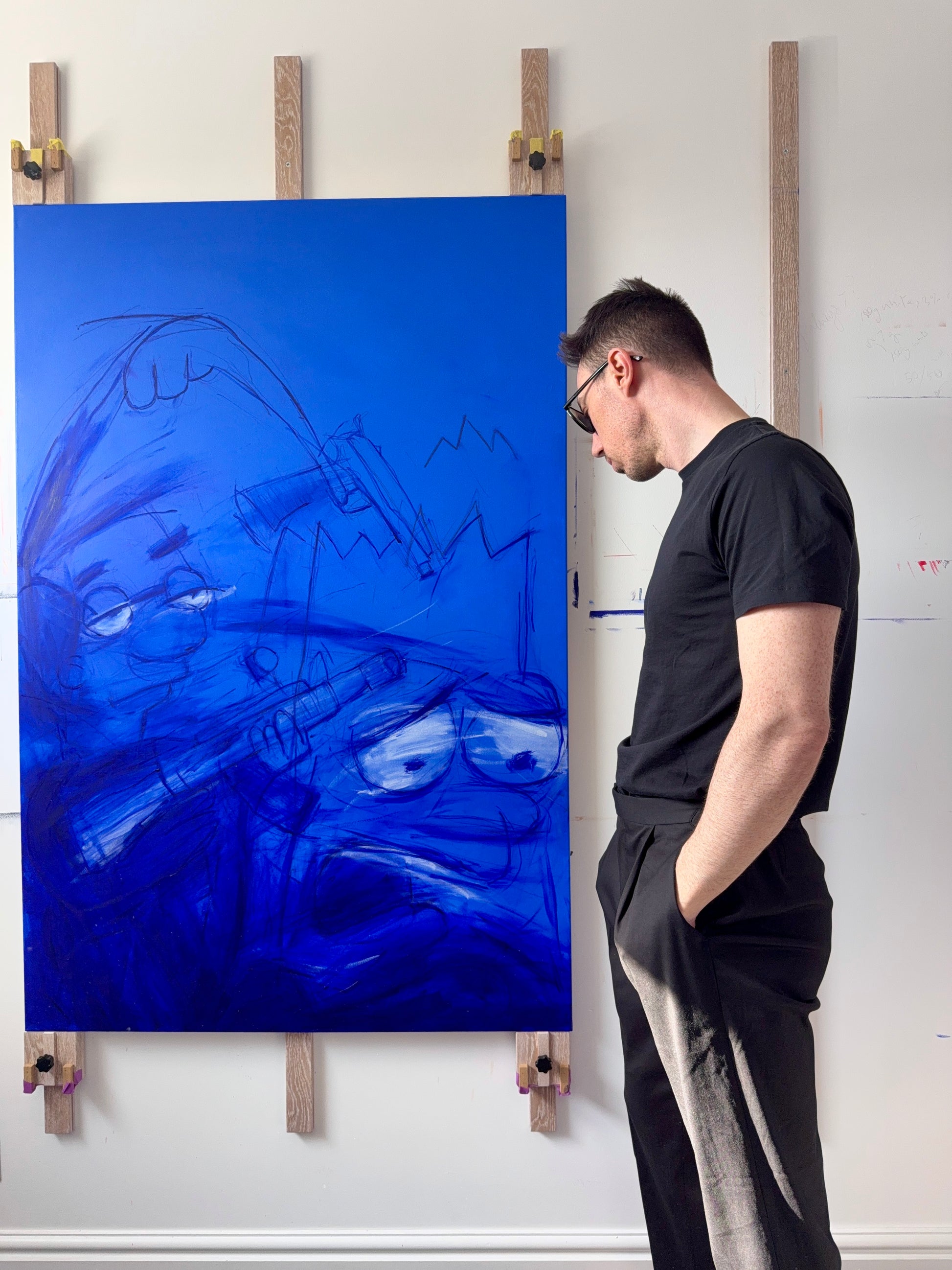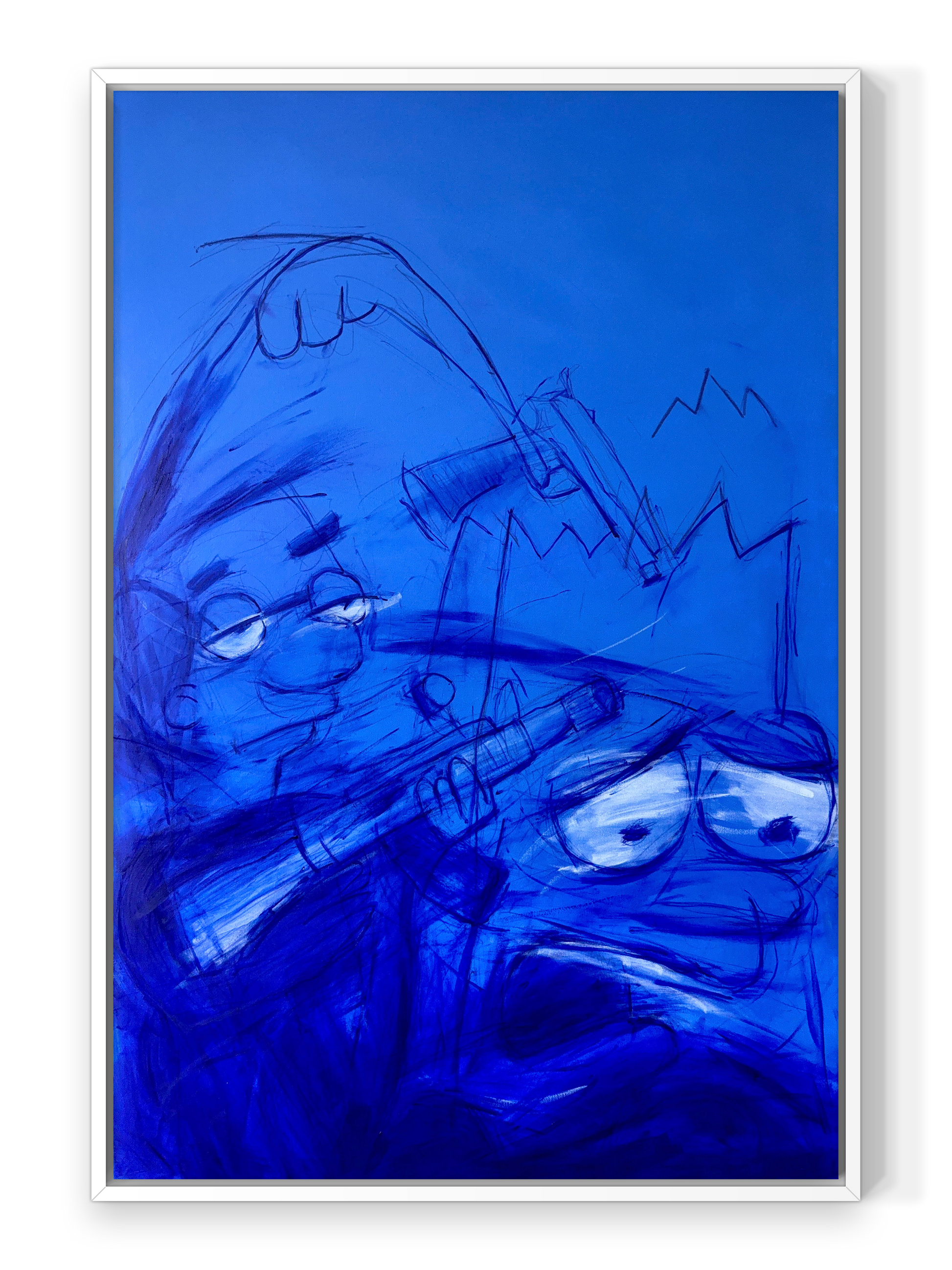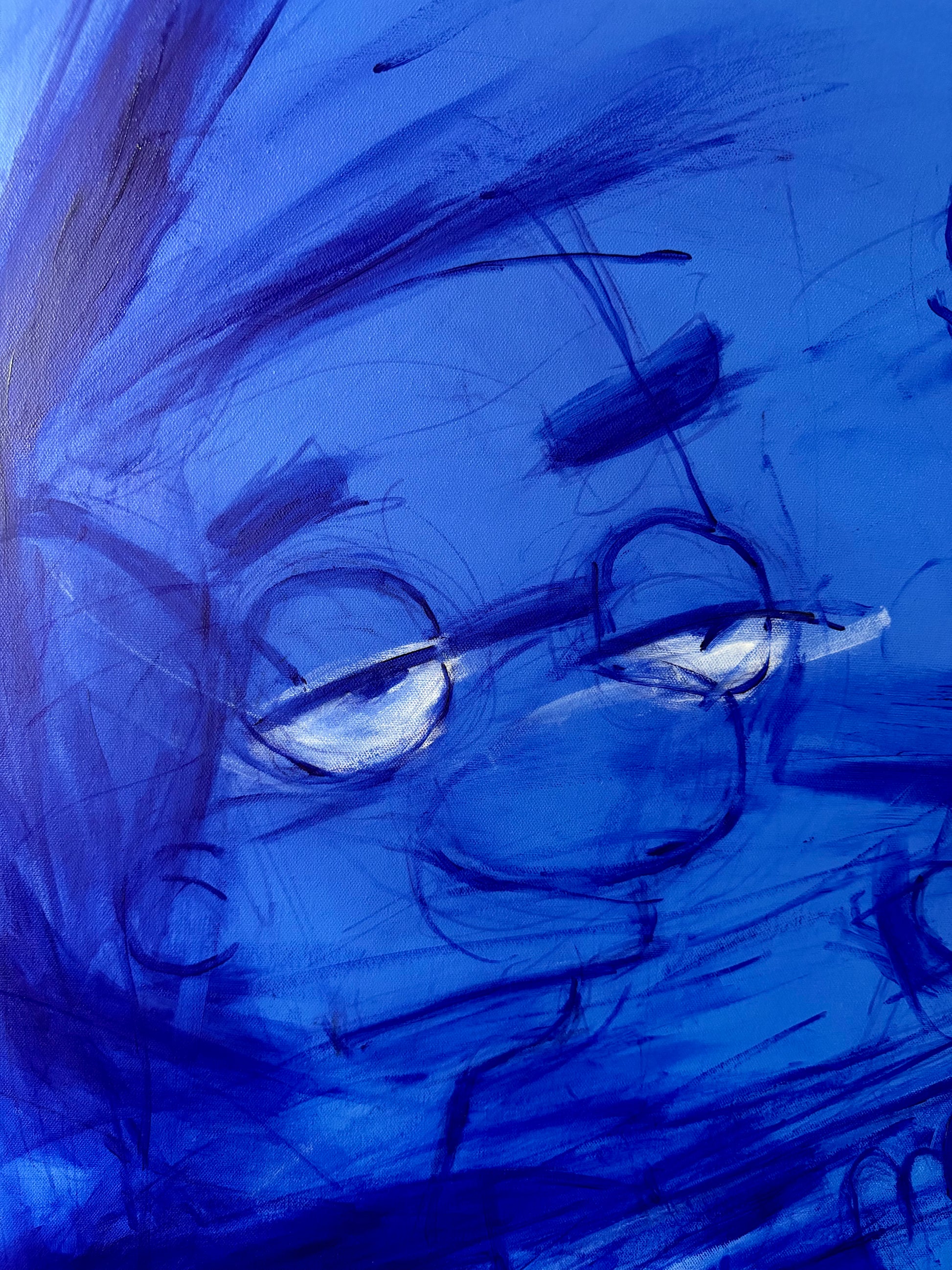 This triptych depicts Milhouse immersed in suffocating cobalt blue, through a cinematic odyssey of self-invention.