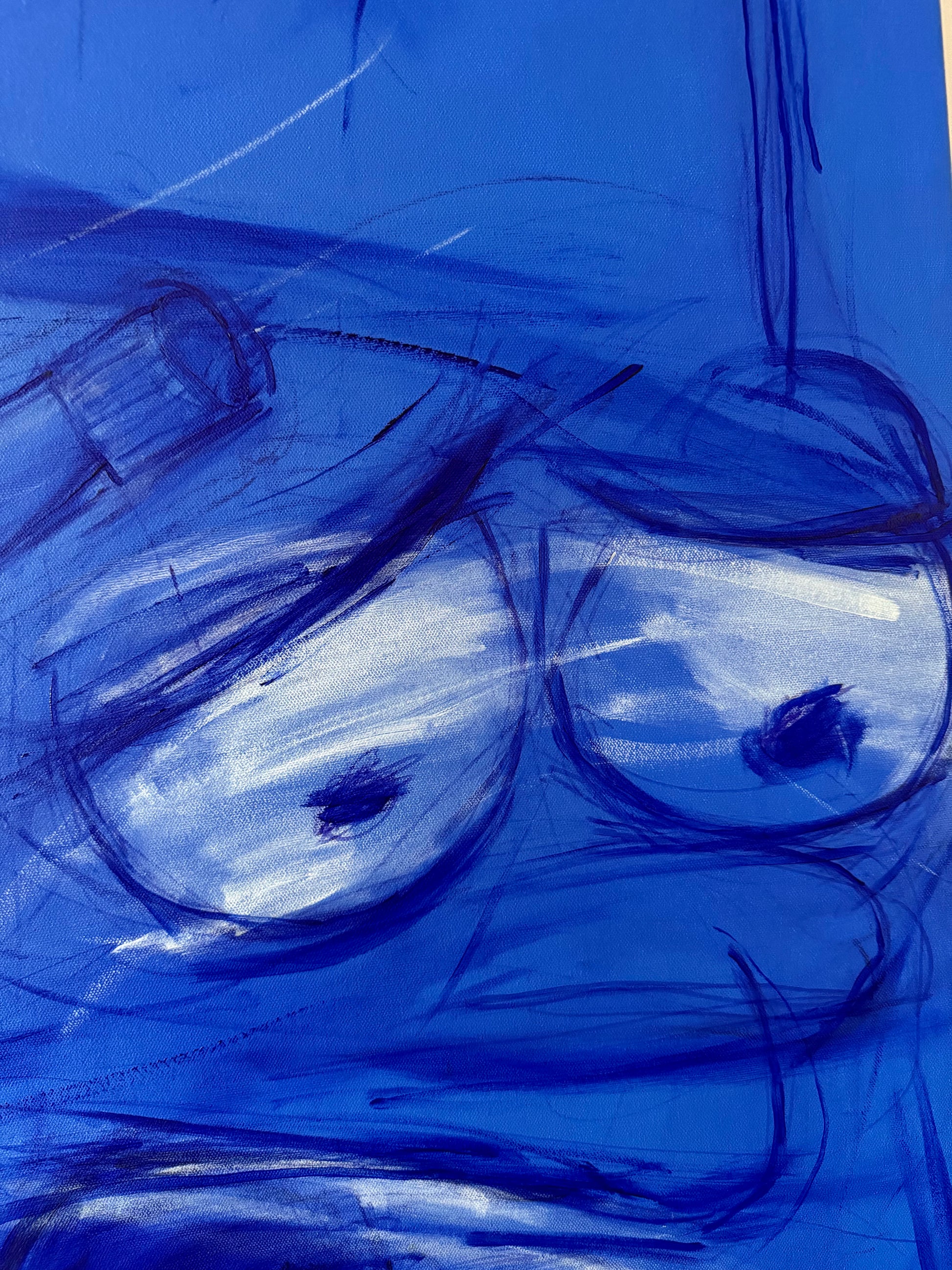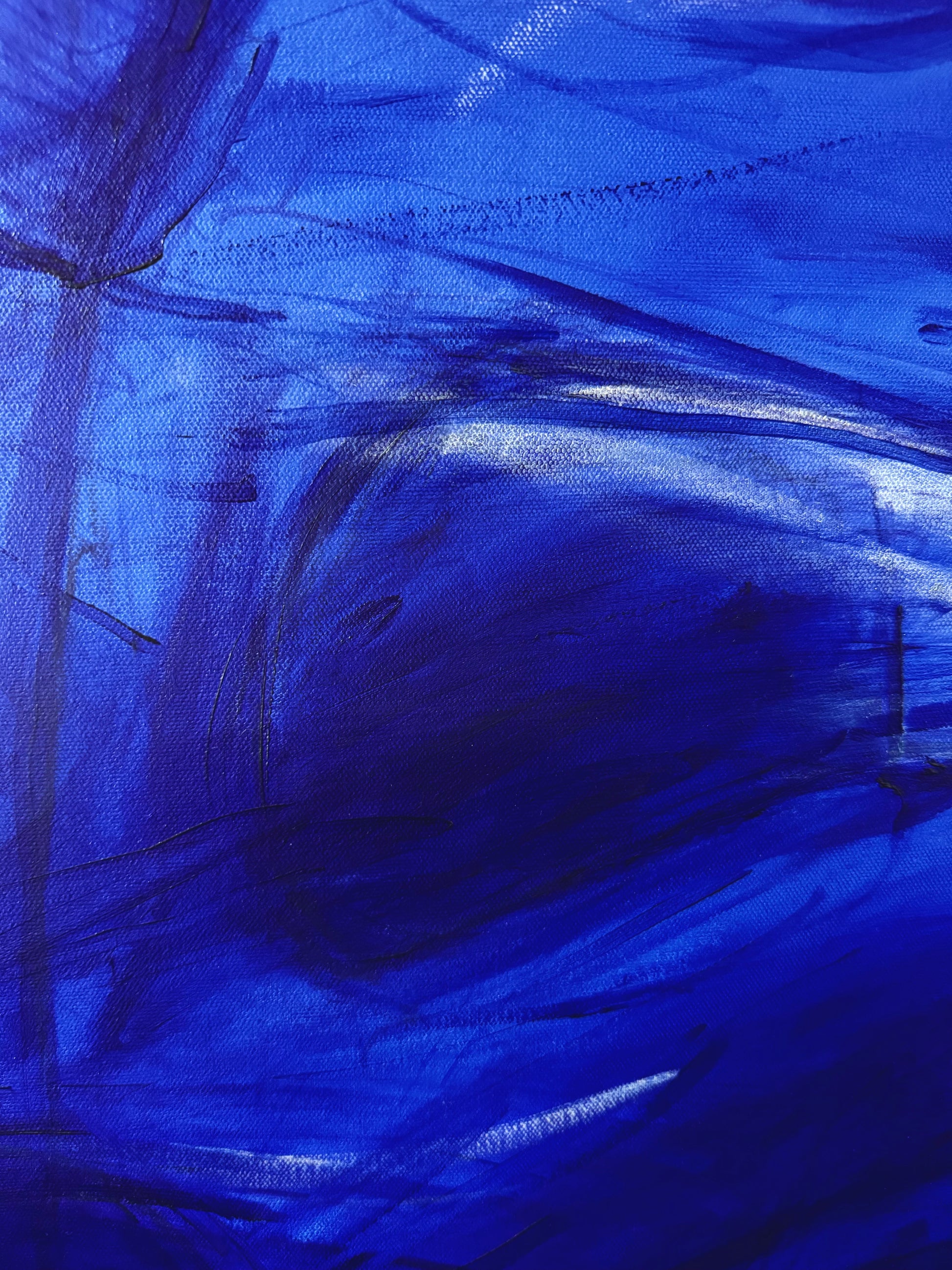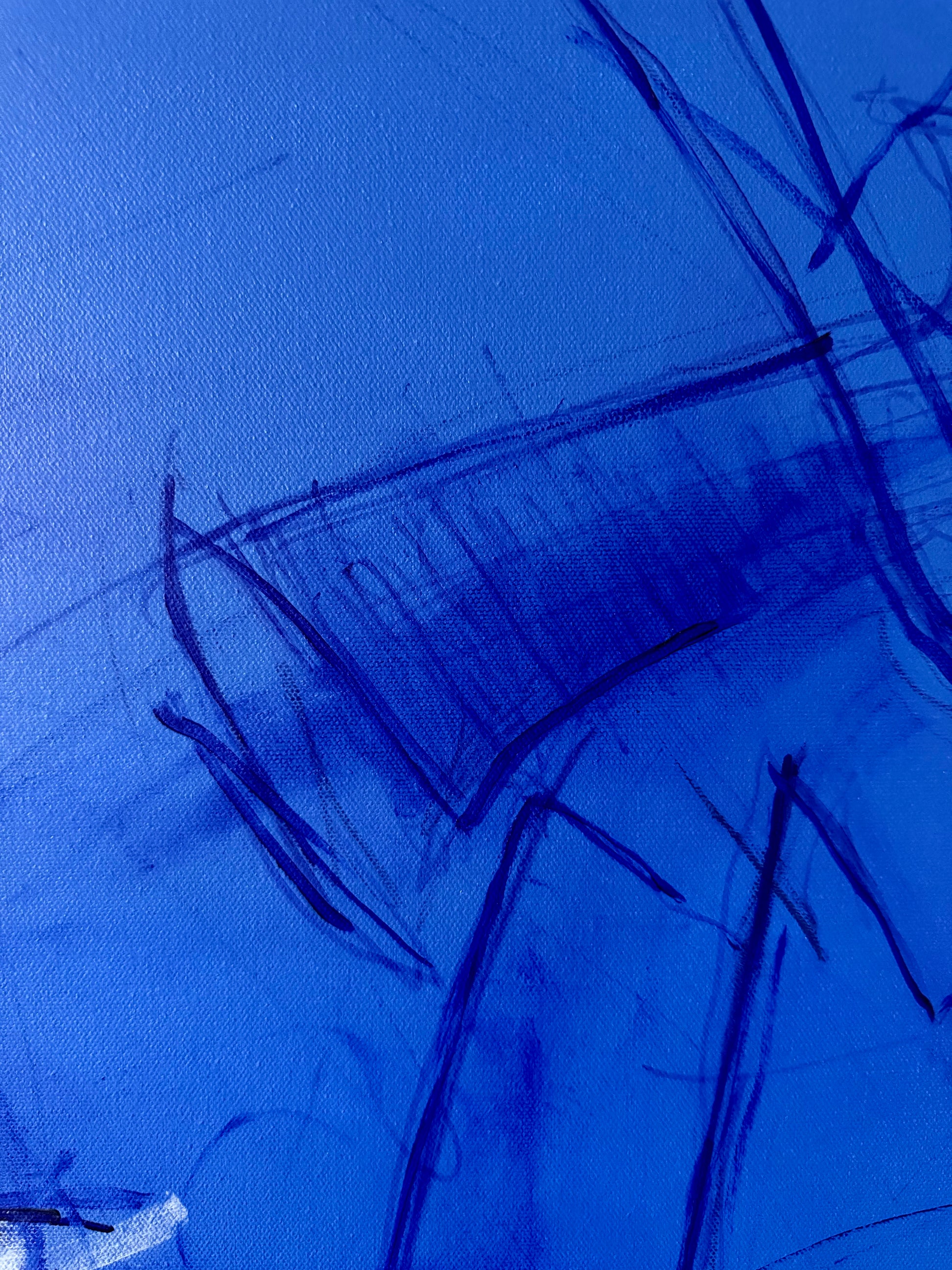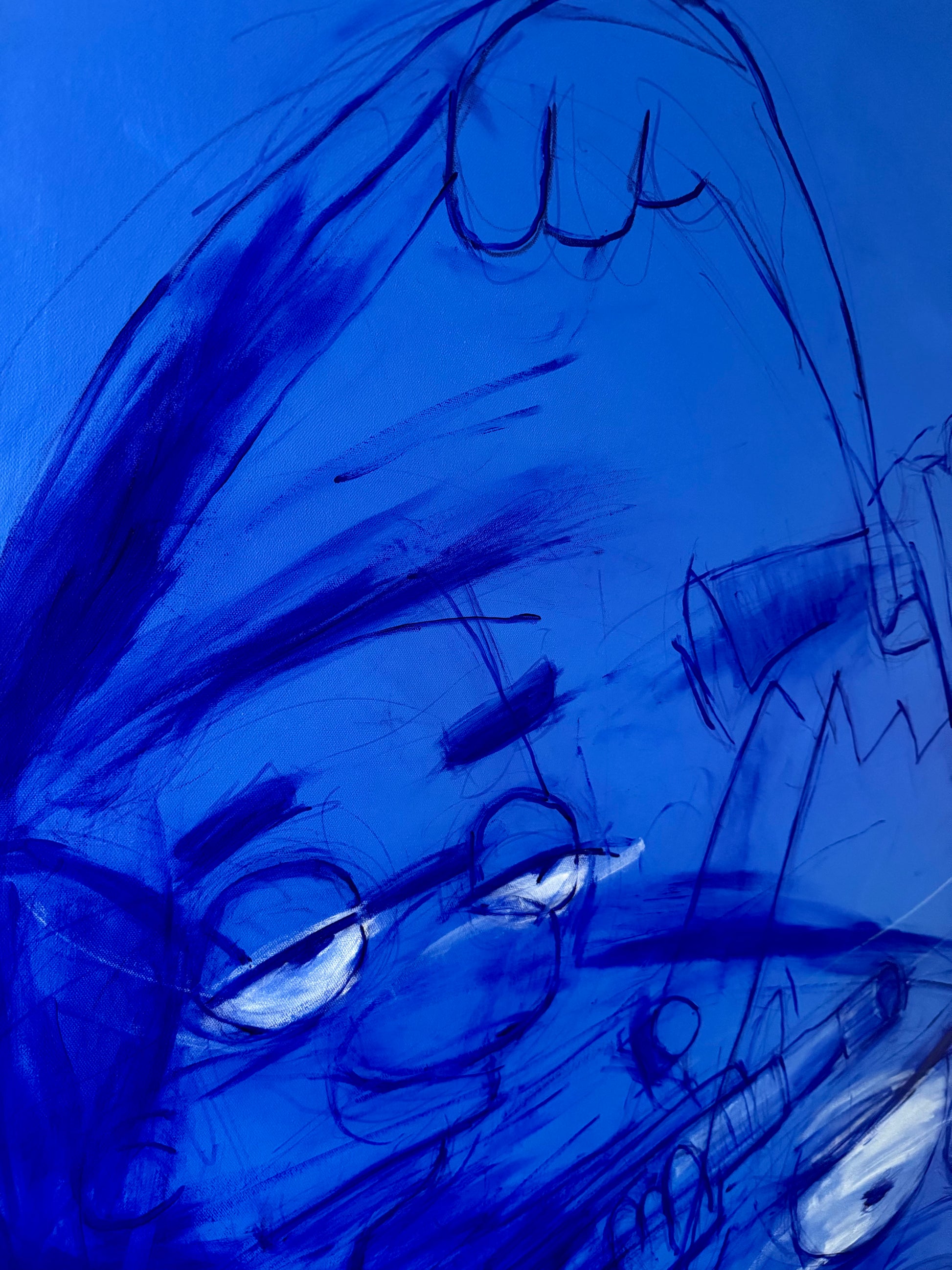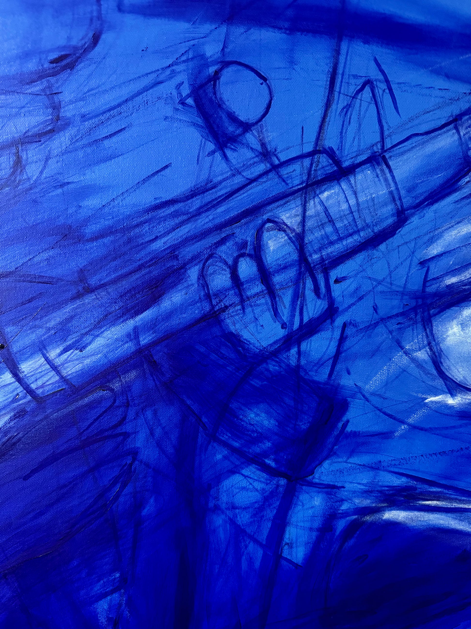The undercurrent of violence seeps through frenetic mark-making, endless layers of shimmering indigo hint at the price of success.
