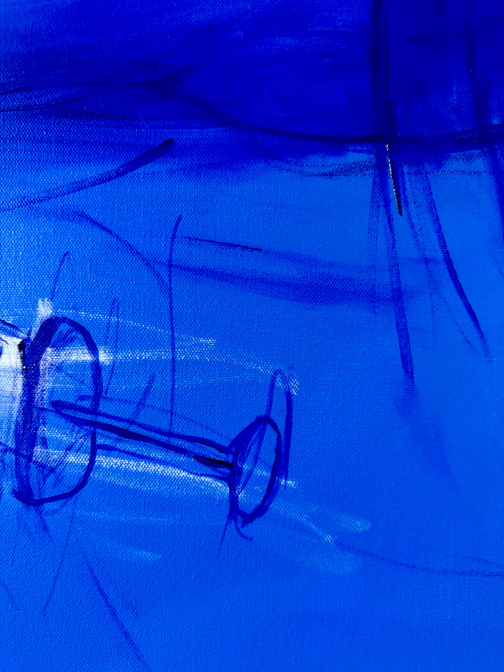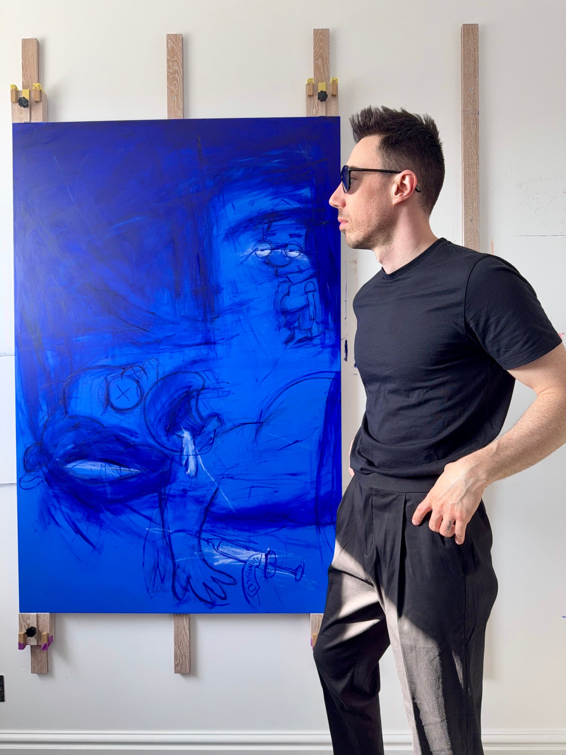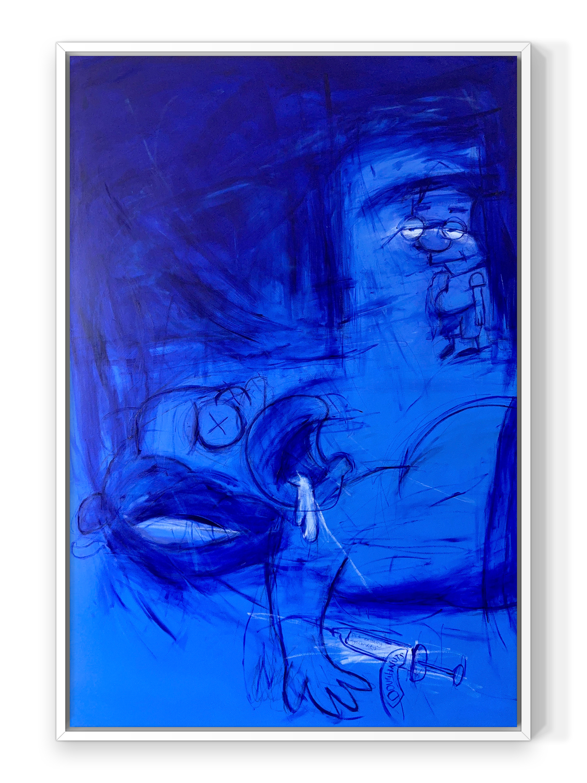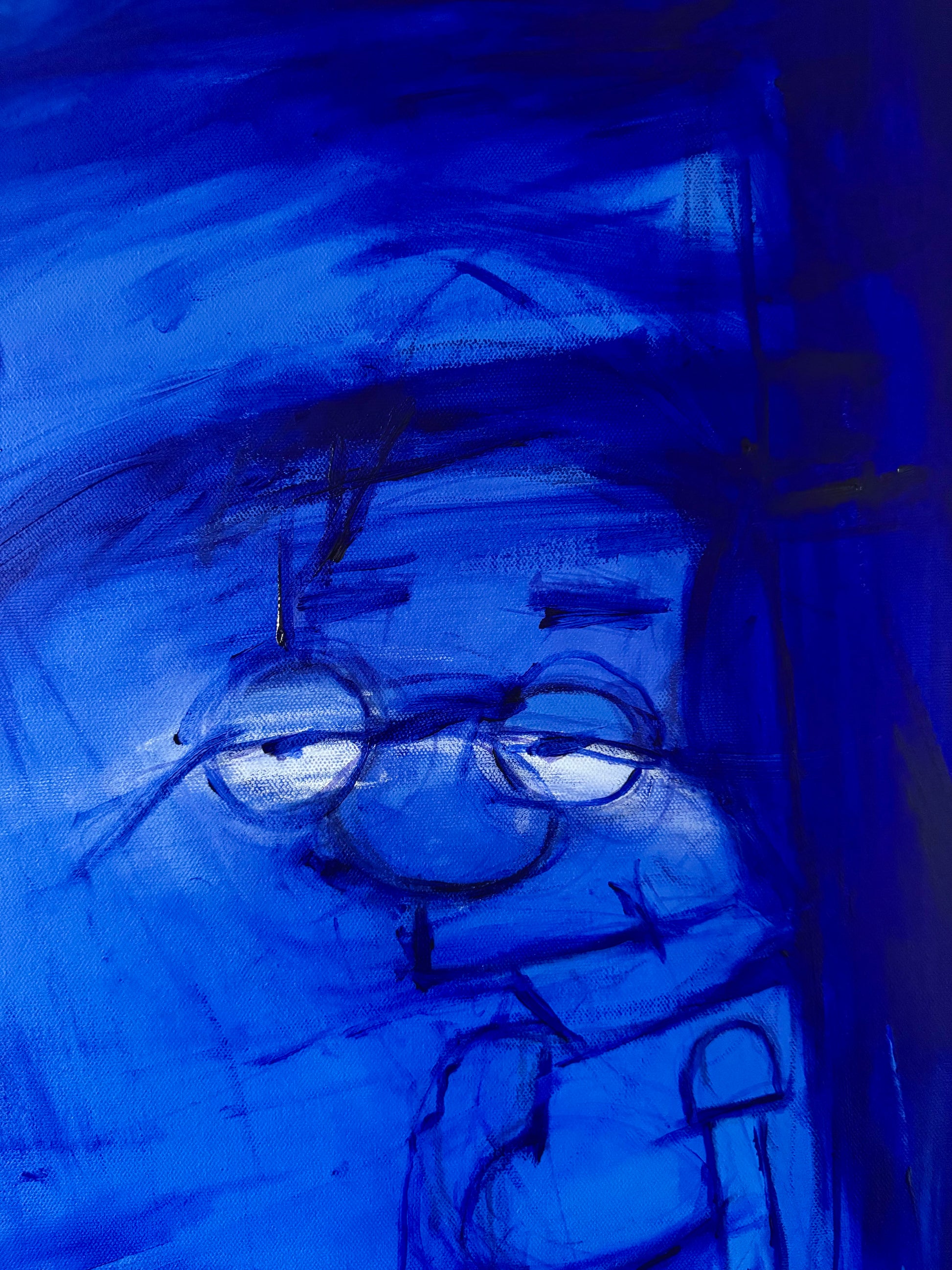 This triptych depicts Milhouse immersed in suffocating cobalt blue, through a cinematic odyssey of self-invention.
