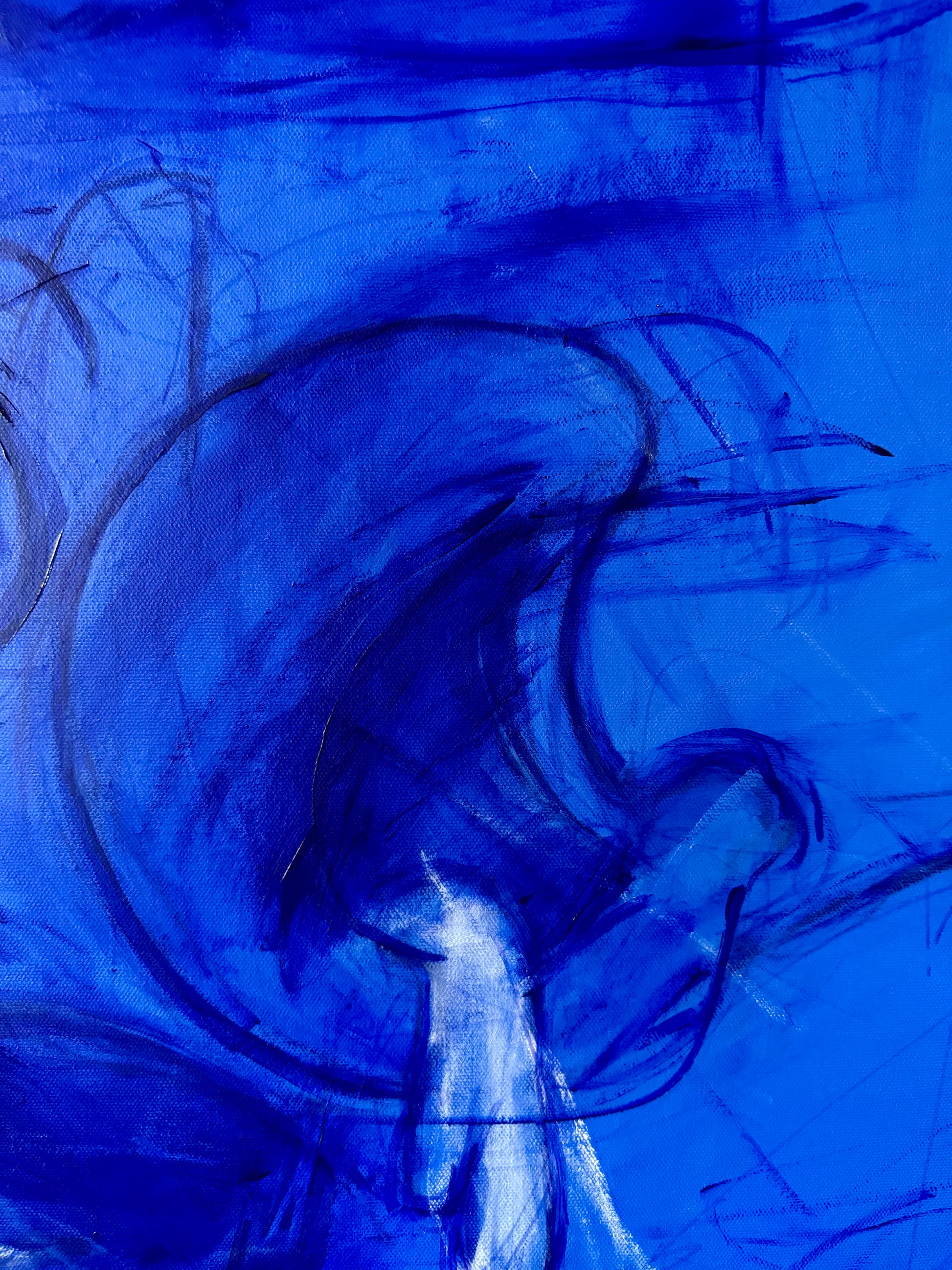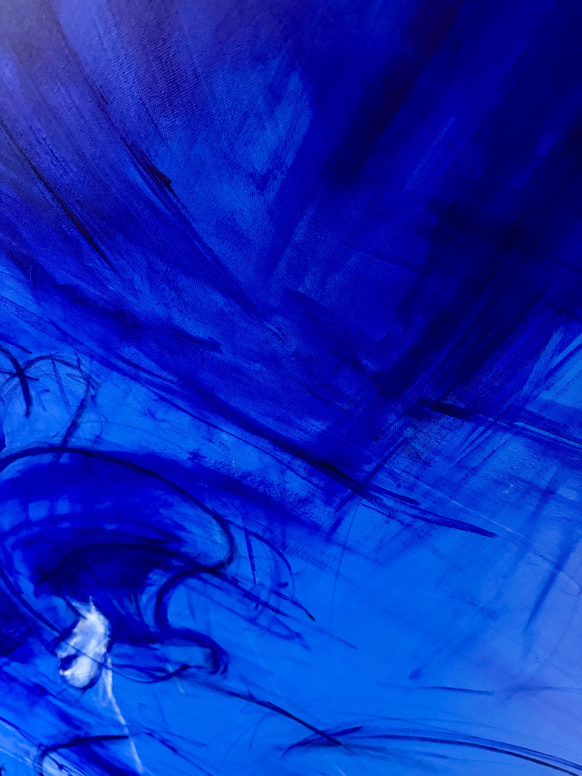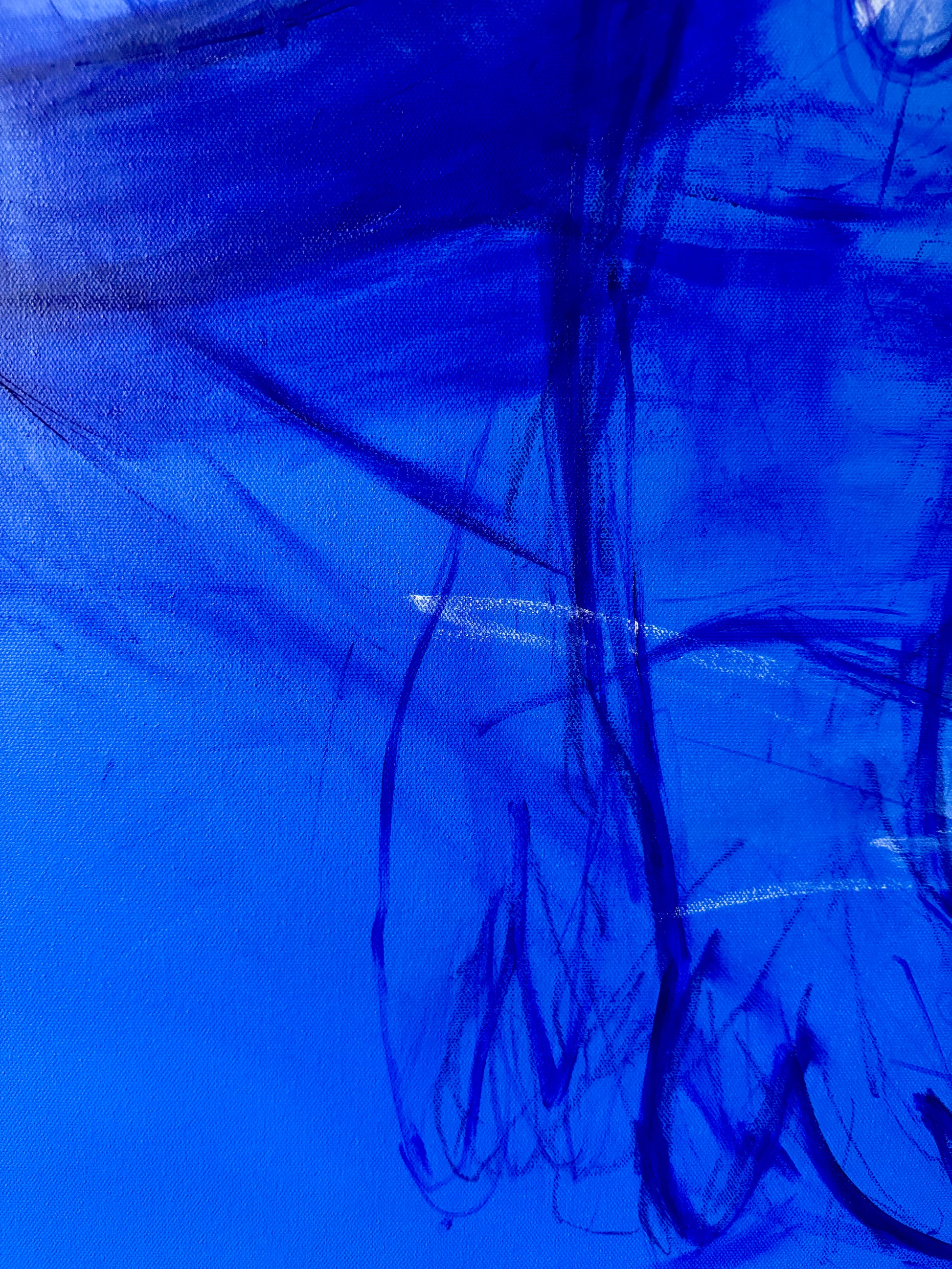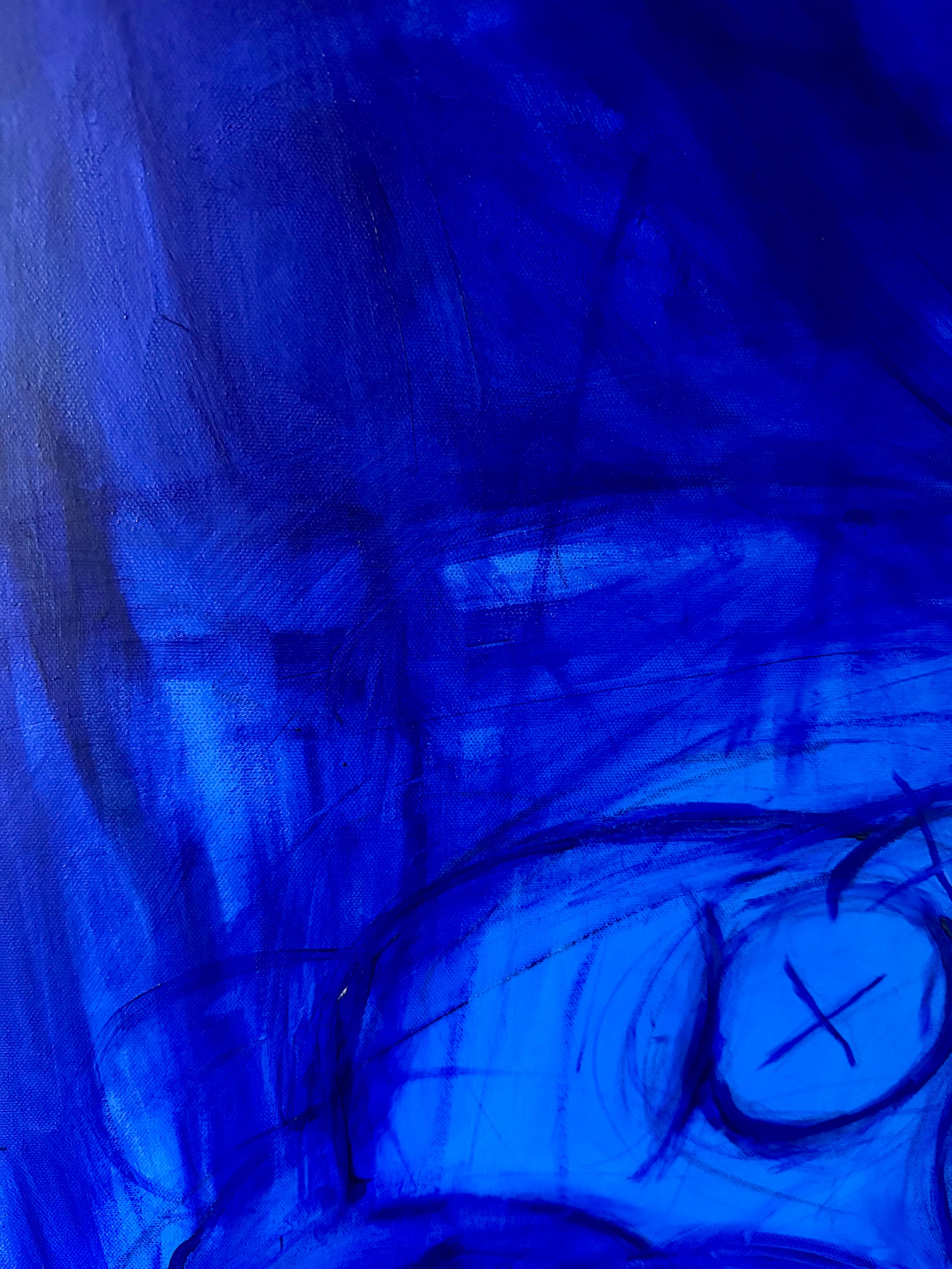 The undercurrent of violence seeps through frenetic mark-making, endless layers of shimmering indigo hint at the price of success.