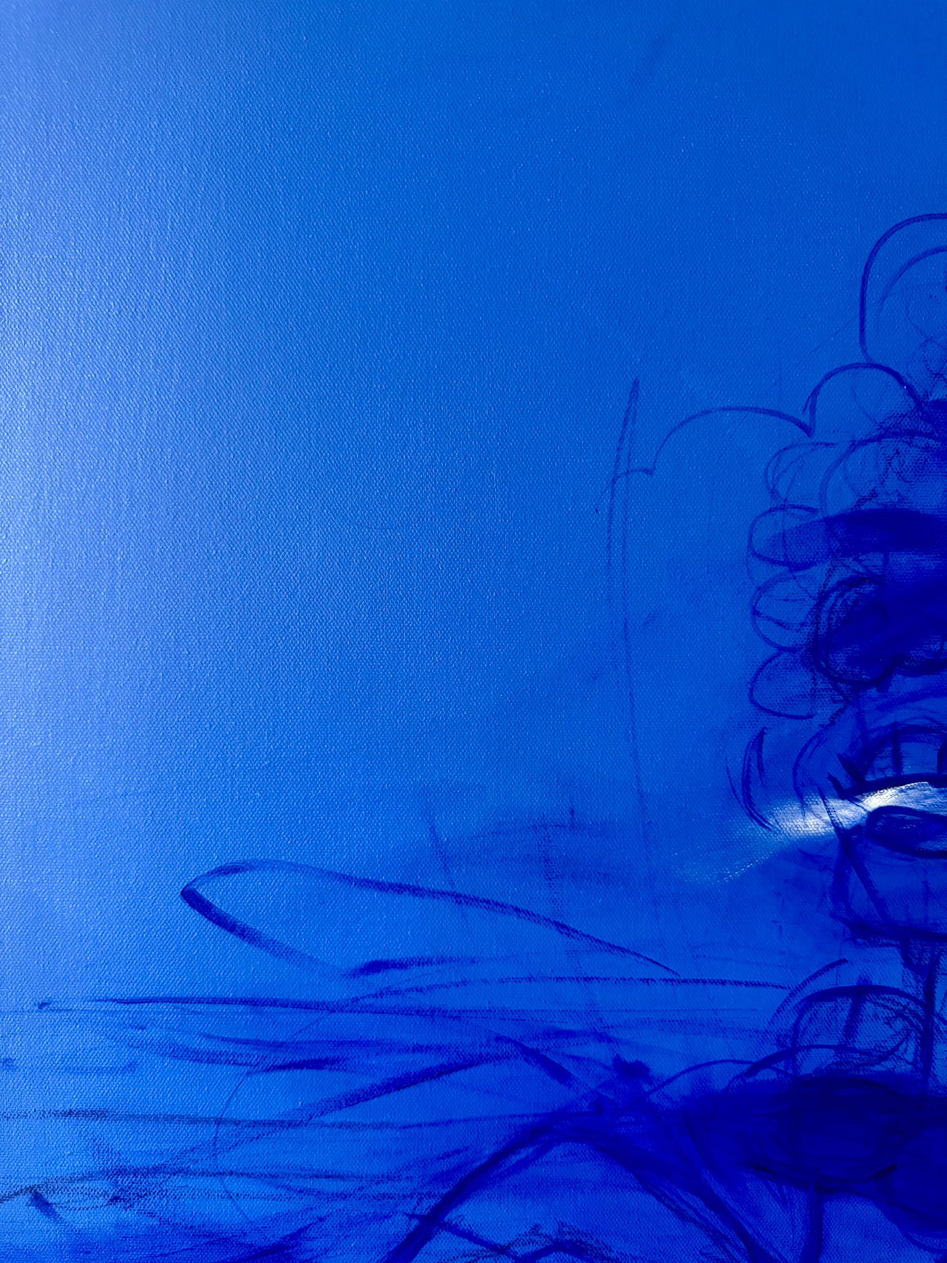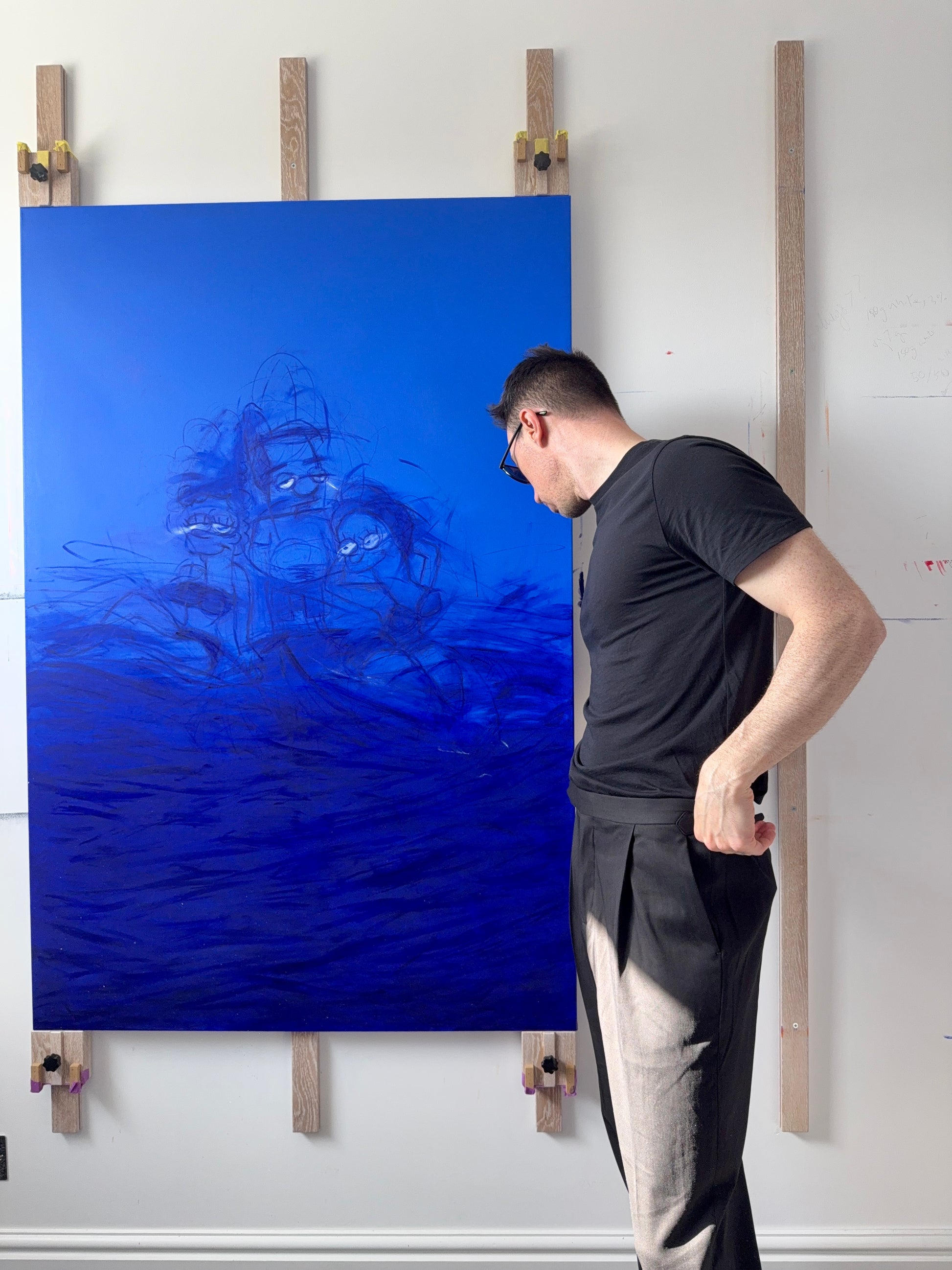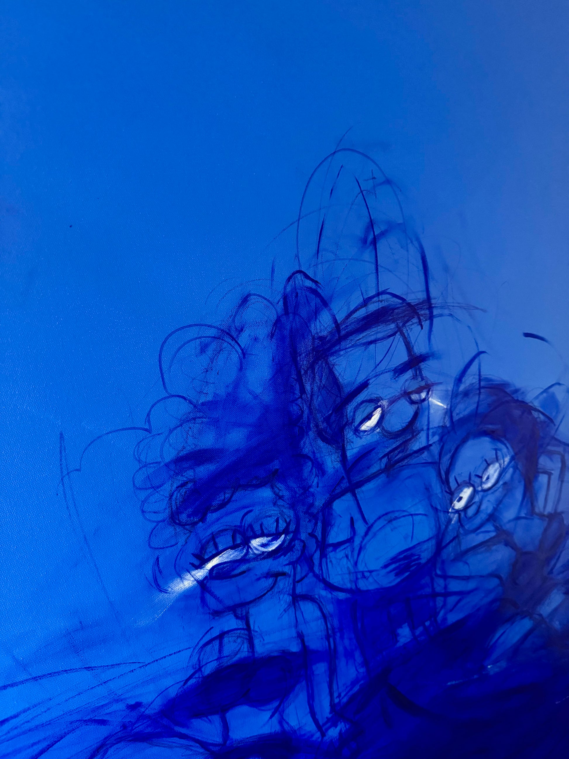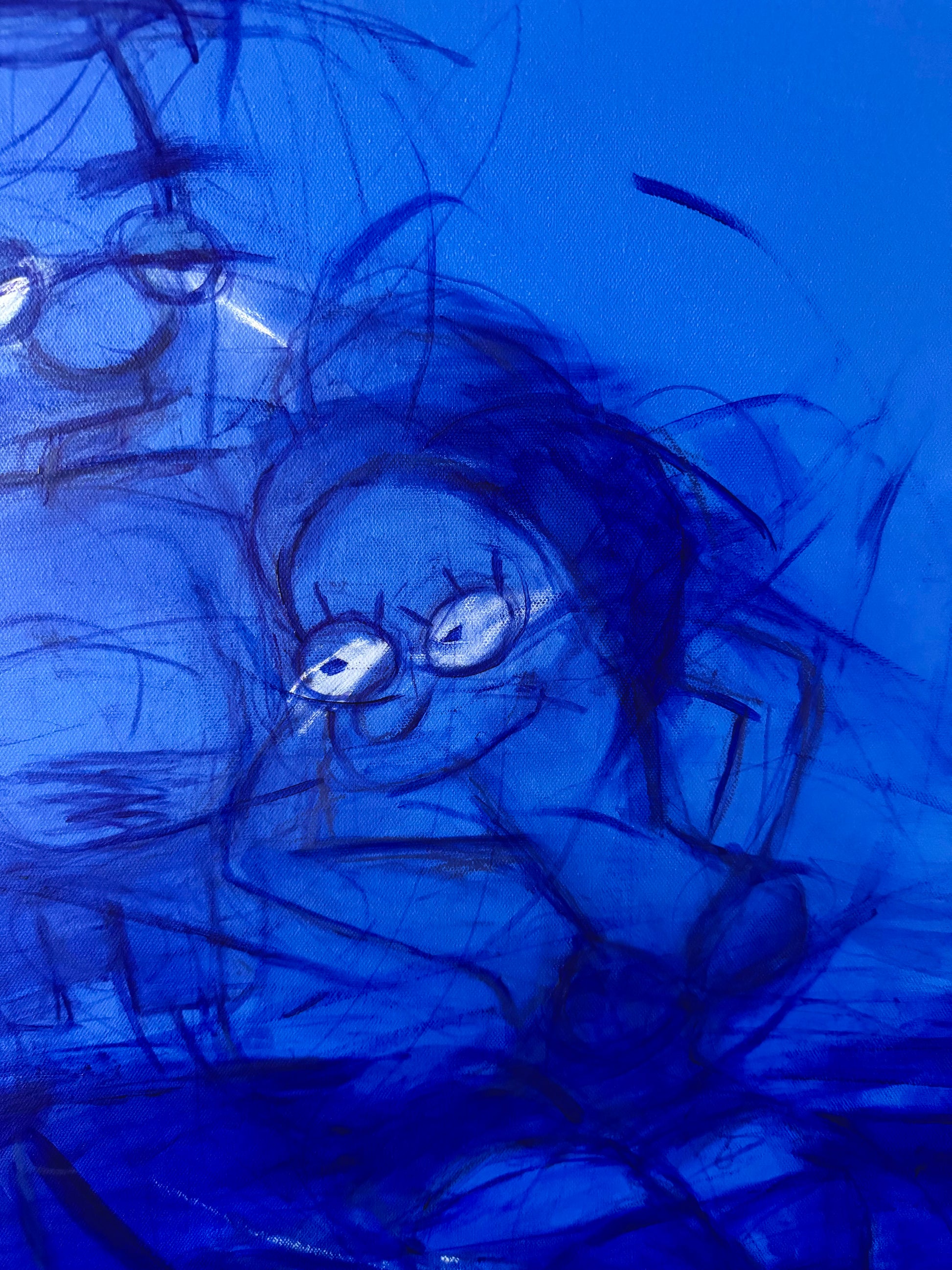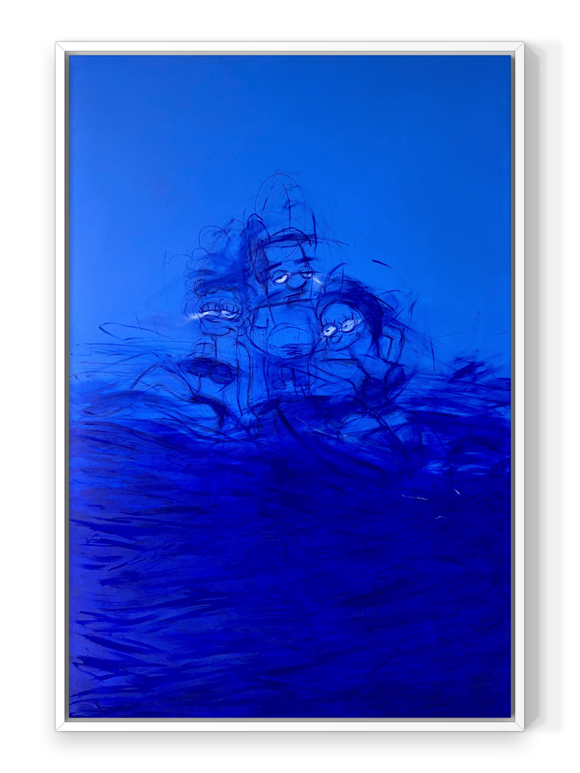 This triptych depicts Milhouse immersed in suffocating cobalt blue, through a cinematic odyssey of self-invention.